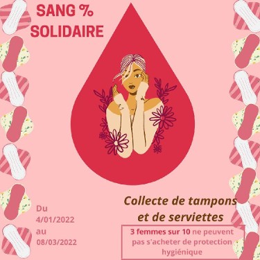 Si vous le souhaitez vous pouvez aider une femme dans le besoin en faisant un don de protections hygiéniques. Ces protections seront redistribués à des femmes dans le besoin avec l'aide d'association comme la croix rouge et les restos du coeur. Pour cela nous nous proposons de les déposer dans l'un des points de collecte ci-joint.
