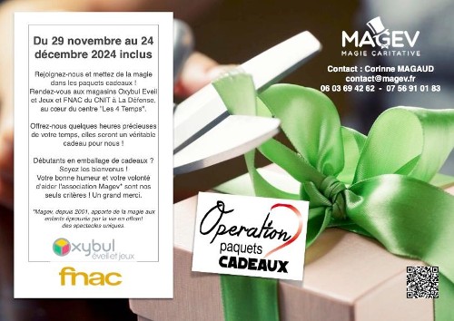 Aujourd'hui, nous t'invitons à participer à la 18ème édition de notre opération paquets cadeaux, qui aura lieu du 29 novembre au 24 décembre, dans les boutiques FNAC et Oxybul Eveil & Jeux à La Défense.