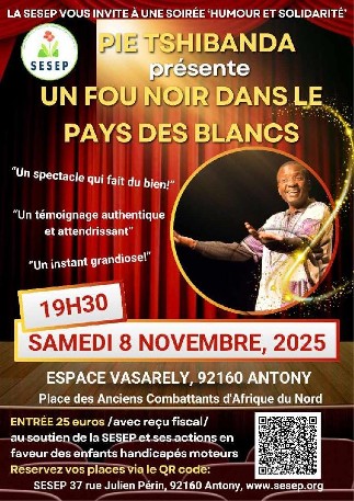 Nous organisons une soirée HUMOUR ET SOLIDARITE le 8 novembre 2025 à 19h30 à l'Espace Vasarely, 92160 Antony. Pie Tshibanda présente son spectacle: Un fou noir dans les pays des blancs. "Un spectacle qui fait du bien!" " Un témoignage authentique et attendrissant" " Un instant grandiose"