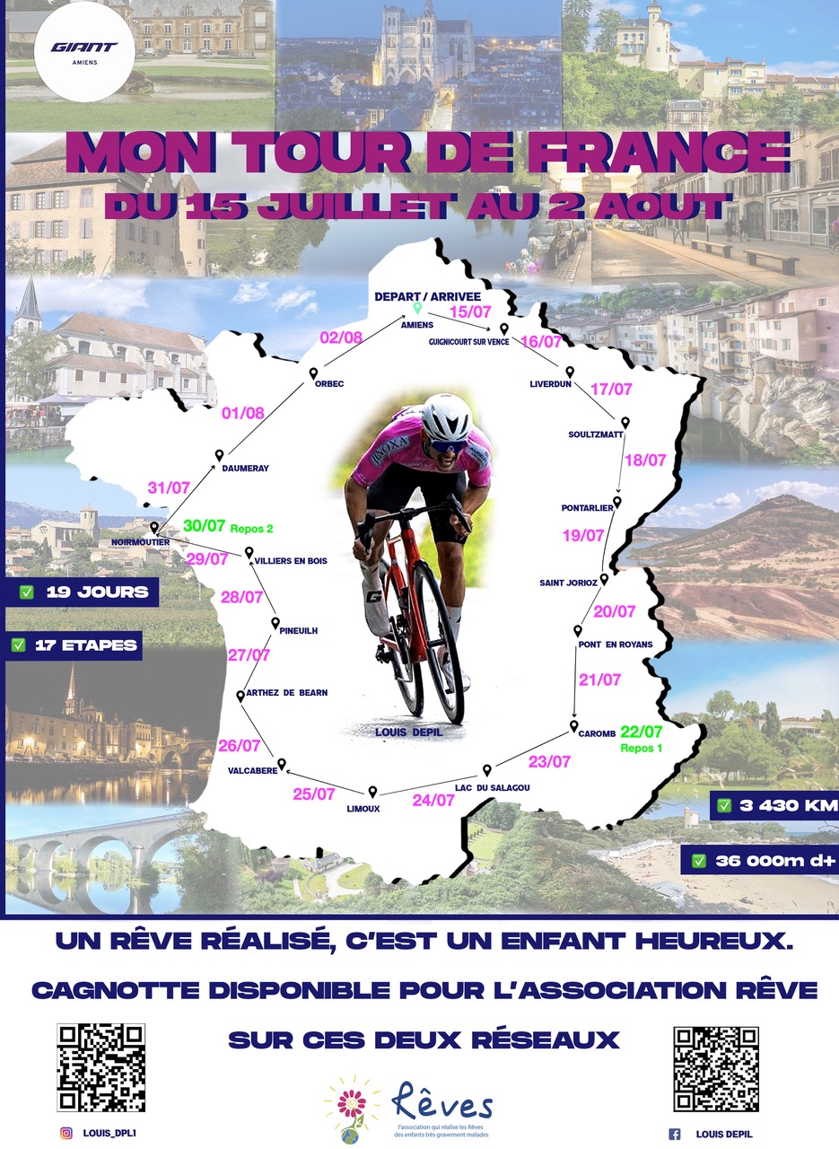 Louis Depil s'élancera au départ d’Amiens le 15 juillet prochain pour 17 étapes d’environ 200km faisant un total de 3430 km et plus de 36 000 m de dénivelé pour conquérir ces deux Rêves !