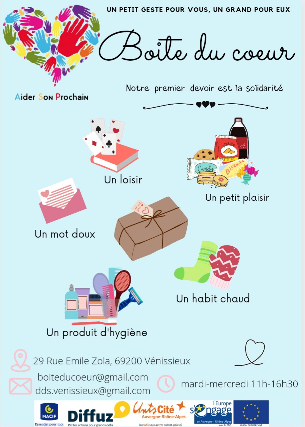 Les dépôts de boites sont possibles les mardis et mercredis entre 11h et 16h30 au 29 Rue Emile Zola, 69200 Vénissieux.