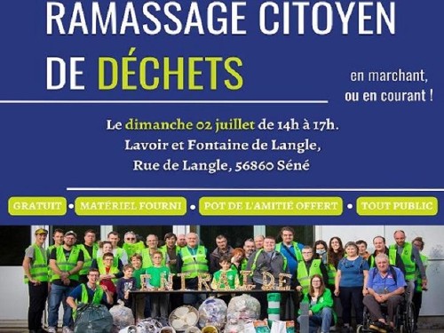 La MACIF et l'association "Qui nettoie si ce n'est toi ?" vous invitent à un ramassage citoyen de déchets le dimanche 2 juillet 2023 de 14h à 17h au Lavoir et Fontaine de Langle, Rue de l'Angle, 56 860 Séné, Vannes agglomération.