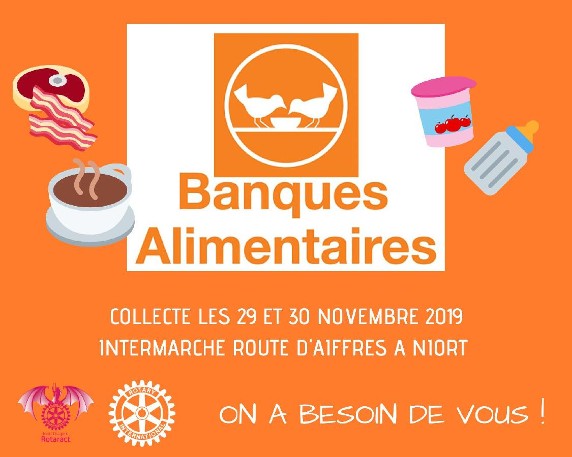 Rejoins-nous les 29 et 30 novembre à l'Intermarché route d'Aiffres pour nous prêter main-forte et participer à la collecte de la banque alimentaire 2019 !
