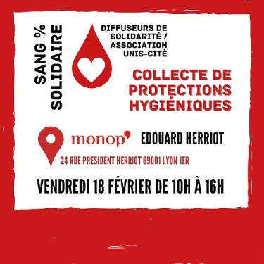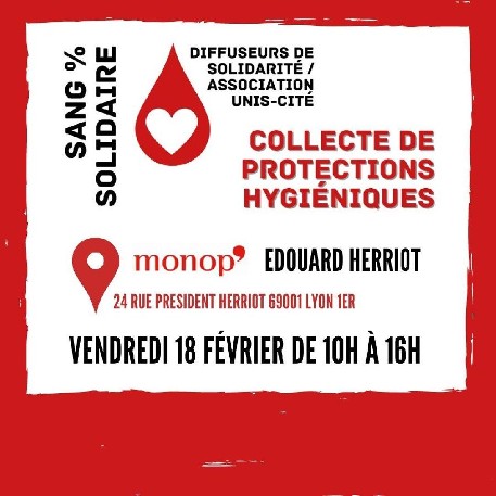 Venez rencontrer l'équipe des Diffuseurs de solidarité pour une collecte de protections hygiéniques organisée le :
