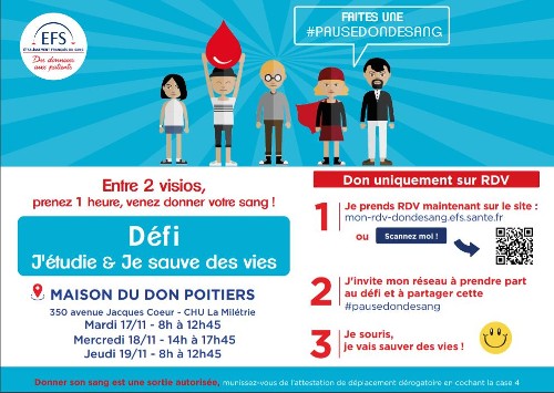Aujourd’hui plus que jamais nous avons besoin de vous ! Alors entre 2 visios, à la pause déjeuner, après les cours, prenez RDV et invitez vos ami.e.s à partager une #pausedondesang. 1 heure suffit pour sauver 3 vies !