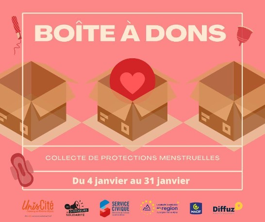 Pour nous aider à réaliser ce défi, vous pouvez déposer des produits hygiéniques pour femmes dans la Boîte à Dons située à La Miete ( 150 rue du 4 août 1789 à Villeurbanne )