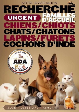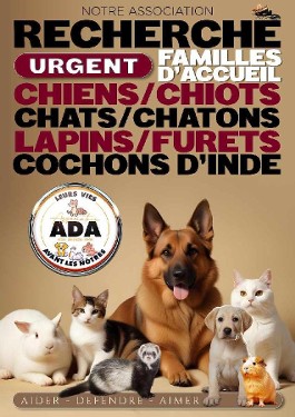 Aider Défendre Aimer (ADA) est une association dédiée à la protection animale et nous recherchons actuellement des familles d'accueil bénévoles qui aimeraient nous aider à sauver des chiens, des chats, des chatons et des nacs.
