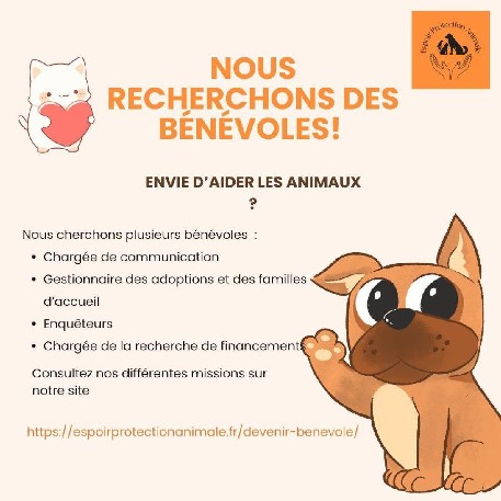 Tu souhaites aider les animaux ? L'association L’espoir de la protection animale, qui se consacre à sauver les chiens de la maltraitance, a besoin de bénévoles pour renforcer ses actions et sauver encore plus d'animaux.