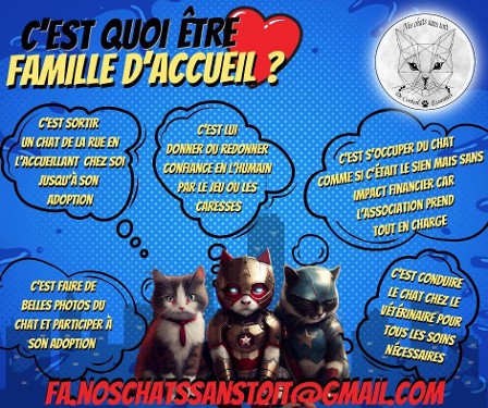 Pour des chats de la rue, abandonnés, malades ou convalescents qui nécessitent une attention particulière et des soins. La personne doit être capable de veiller sur eux à chaque instant et/ou d'assurer des visites chez nos vétérinaires partenaires selon les besoins de l'animal.