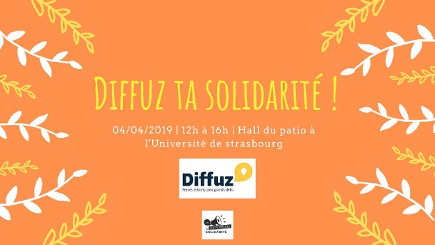 Si tu souhaites échanger sur ton expérience de bénévolat, rejoins nous le Jeudi 4 Avril au hall du patio de 12h à 16h, sur le Campus de l’Université de Strasbourg. Nous y tiendrons un stand de sensibilisation à l’engagement solidaire et de présentation de l’outil Diffuz.