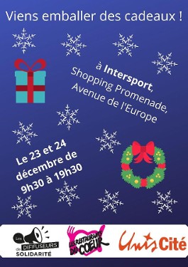 En équipe, viens aider le stand des Restos du Coeur à la sortie de Intersport à emballer les achats de Noël. Dans un esprit convivial cher aux Restos, participe à ce défi entre amis et aide l’association à donner le sourire aux plus démunis.
