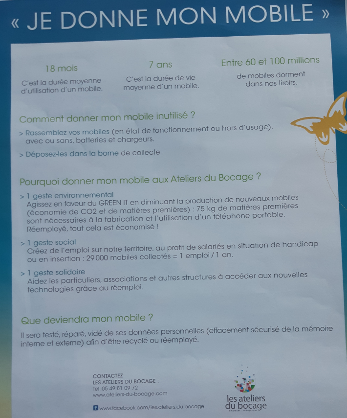 Vos téléphones seront donnés aux Ateliers du Bocage, entreprise d'insertion du mouvement Emmaüs France. Ils seront recyclés ou réemployés afin qu'ils soient distribués vers des programmes solidaires d'accès au numérique en faveur des séniors, d'enfants dyslexiques...