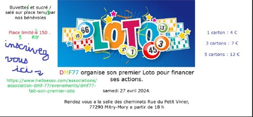 soirée loto organiser par DMF77 (Dyspraxique mais fantastique). Cette soirée est organisée pour recolter des gains qui vont contribuer au financement de l'association DMF77.