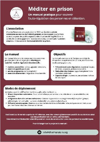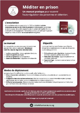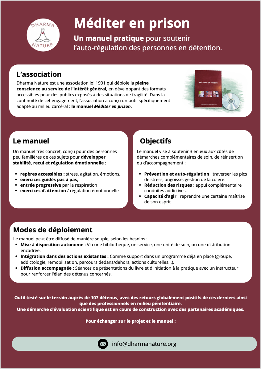 Dharma Nature est une association loi 1901 qui déploie la pleine conscience au service de l'intérêt général, en développant des formats accessibles pour des publics exposés à des situations de fragilité. Dans la continuité de cet engagement, l'association a conçu un outil spécifiquement adapté au milieu carcéral : le manuel Méditer en prison. Des séances de méditation sont proposées en présentiel pour accompagner le manuel.