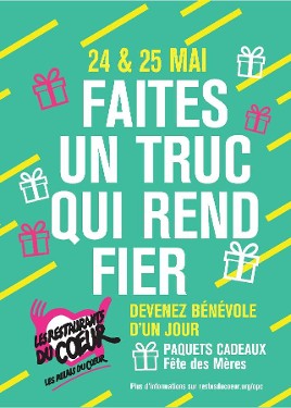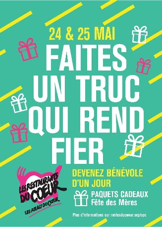 Le 24-25 mai et le 14-16 juin prochain, l’association des Restaurants du Cœur vous invite à participer à ses Opérations Paquets Cadeaux spéciales fêtes des mères et fêtes des pères.