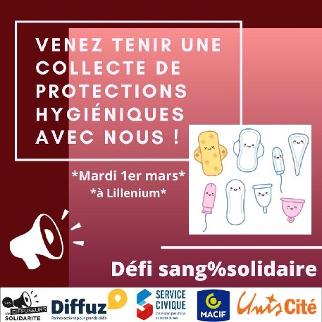 Aujourd’hui on t'invite à venir tenir une permanence de collecte de protections hygiéniques le mardi 1 mars à Lillenium dans le cadre de la collecte nationale. à l'issue de l'action sang%solidaire, notre équipe s'est mise d'accord pour reverser nos récoltes aux associations Petit Bagage d'Amour et l'association Agir pour la santé des femmes.