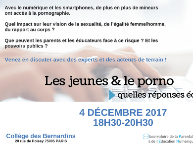 "Vers le haut" est une association partenaire d'Apprentis d'Auteuil. Elle organise lundi 4 décembre 2017 une conférence sur le thème "les jeunes et le porno : quelles réponses éducatives ?" (détails sur le site de l'association), au collège des Bernardins (un lieu magnifique - à découvrir si vous ne connaissez pas!) Nous recherchons deux bénévoles disponibles ce soir-là (à partir de 17h) pour nous aider à installer l'accueil et l'auditorium, puis à accueillir, pointer et diriger les intervenants & les participants. Possibilité d'assister à la conférence ensuite.