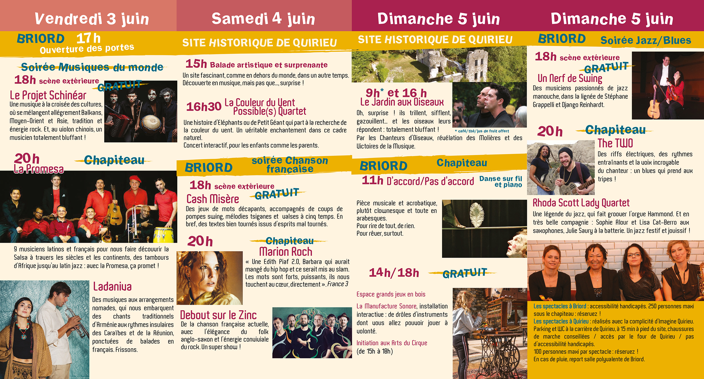 - Une programmation qui conjugue artistes en émergence et artistes reconnus nationalement et internationnalement. Musique du monde, chanson, jazz, spectacles familiaux, des choix volontairement éclectiques afin de s’adresser à un public le plus large possible. Le tout dans une alternance entre spectacles payants et concerts gratuits, là encore une volonté de s’adresser au plus grand nombre.