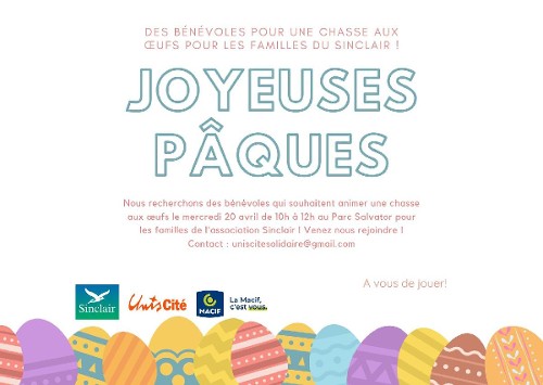 La démarche est simple : encadrer et passer un bon moment avec les familles, accompagnées de l’association Sinclair, lors d’une chasse aux œufs, organisée le mercredi 20 avril, au parc Salvator de 10h à 12h.