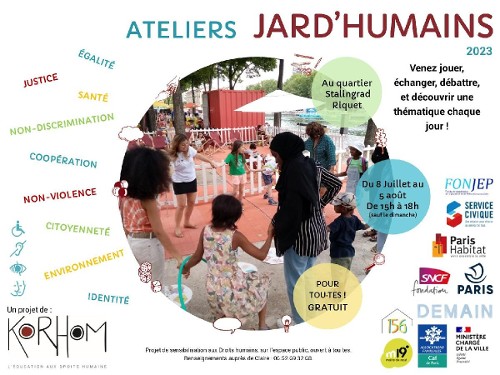 Durant tout le mois de juillet, Korhom anime un stand d'activités ouvert à tou·tes dans l'espace public. Chaque jour, des jeux et débats sont proposés sur une thématique différente, en lien avec les Droits humains : l'égalité filles-garçons, la non-violence, l’identité, la gestion des émotions, la protection de l’environnement, etc. Des jeux coopératifs et artistiques ainsi que d'autres activités seront également proposés par Korhom et ses associations partenaires !