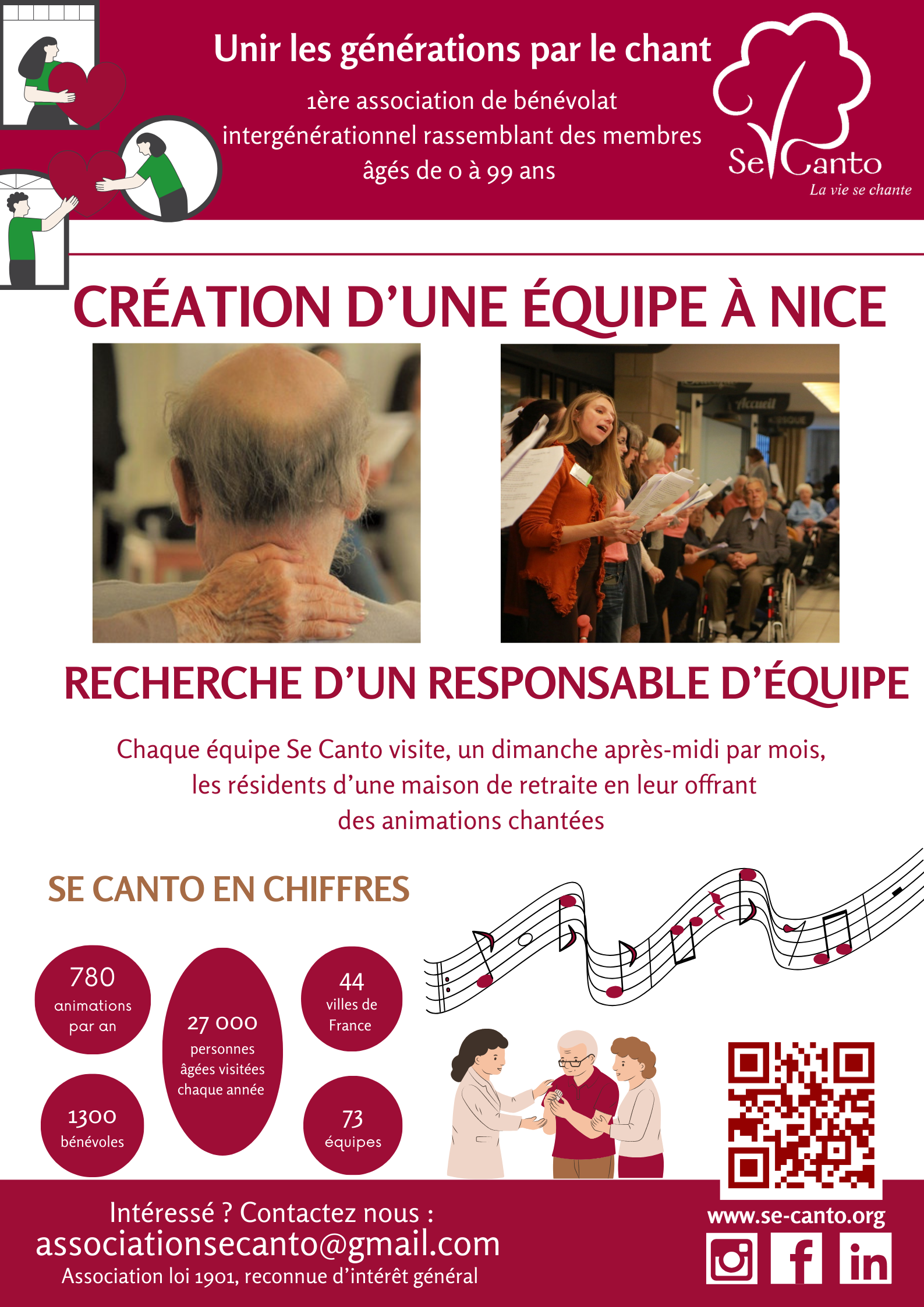 Dans le cadre de la création d'une équipe Se Canto à Nice, nous recherchons un responsable d'équipe !